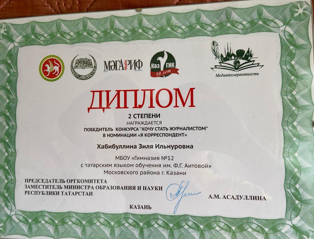 - Региональная конференция "Медиатолерантность - 2019"/ конкурс "Хочу стать журналистом"/ Зиля Хабибуллина - 2 место