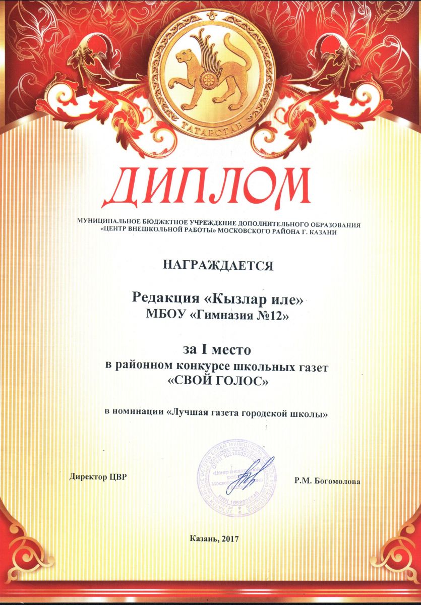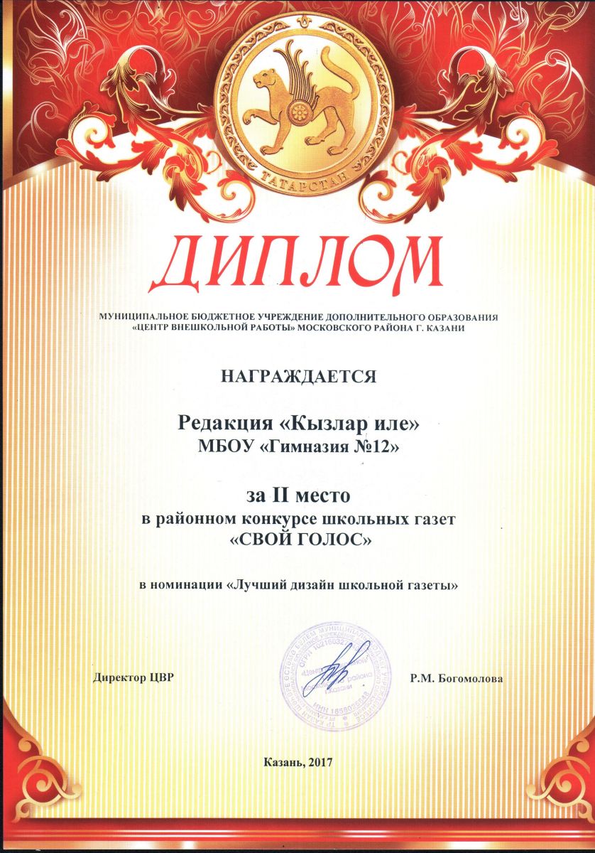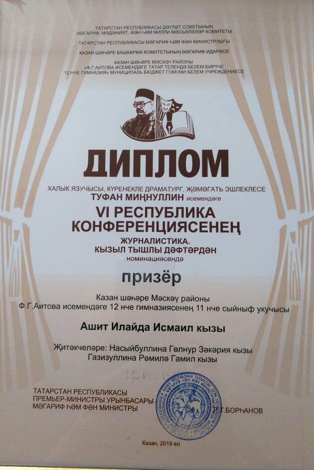 - Республиканская НПК имени Т.А.Миннуллина/ Конкурс детской прессы "Наше слово"/ Редакция газеты "Кызлар иле" - Победитель