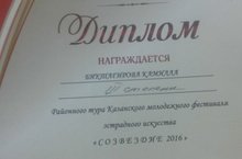 Поздравляем Биктагирову Камиллу с победой - диплом III степени - районного тура Казанского молодежного фестиваля эстрадного искусства "Созвездие 2016"! Желаем дальнейших побед!