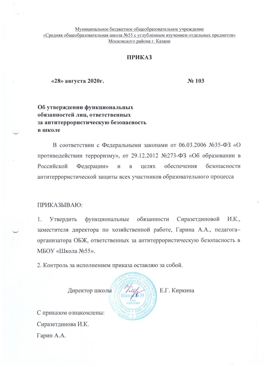 Приказ о назначении лиц, ответственных за антитеррористическую безопасность в школе