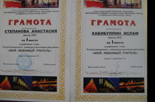 Отдел образования Управления образования Исполнительного комитета муниципального образования г.Казани по Кировскому и Московскому району награждает Хабибуллина Ислама-ученика 3А класса и Степанову Анастасию-ученицу 6А класса, занявших 1 место в районном этапе Республиканского конкурса-выставки рисунков "МОЙ ЛЮБИМЫЙ УЧИТЕЛЬ".