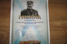 Награждается учащийся 8А класса Моисейцев Роман за участие в творческом конкурсе, посвященном 150 летию со дня рождения адмирала Российского флота Николая Оттовича фон Эссена.(Руководитель :Храмова.Э.Ш)