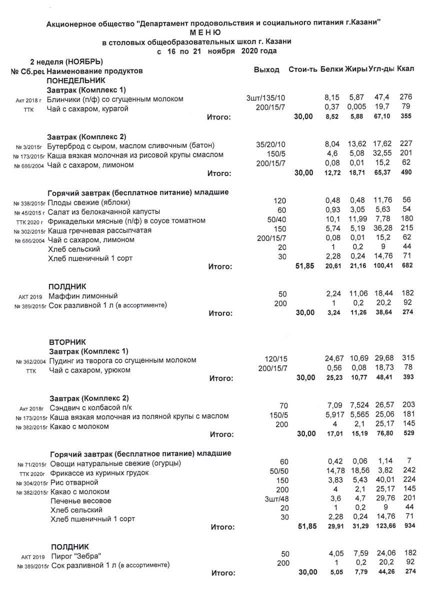 Меню для учащихся начальной школы 14 по 19 декабря 2020 года. Пятница, суббота. Льготники