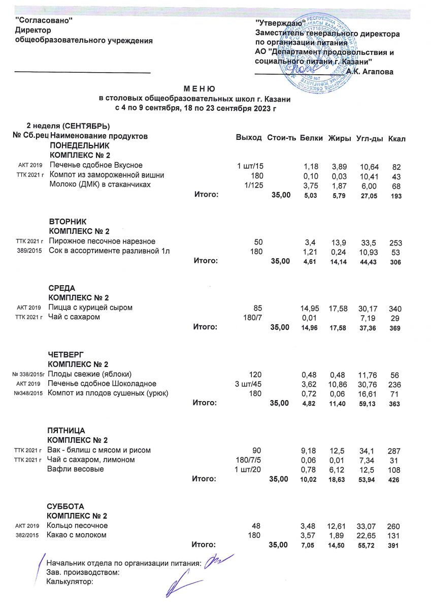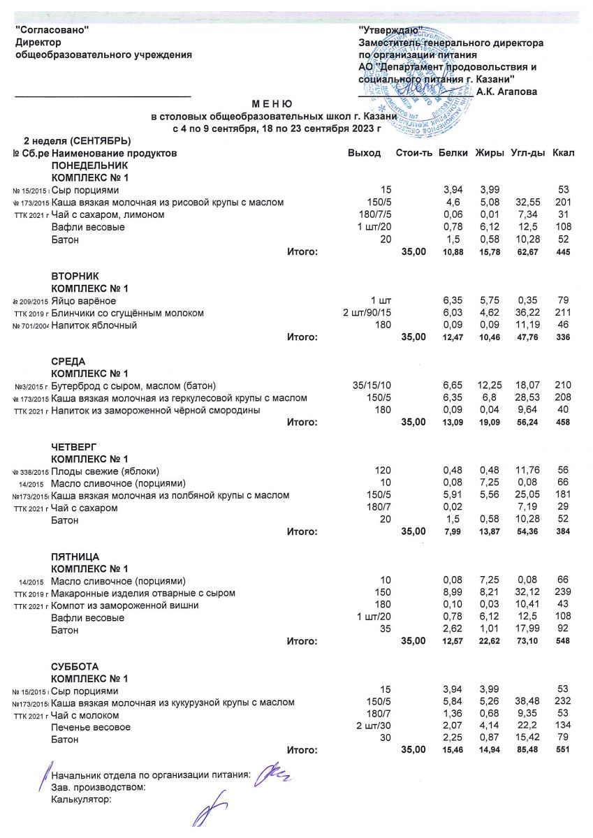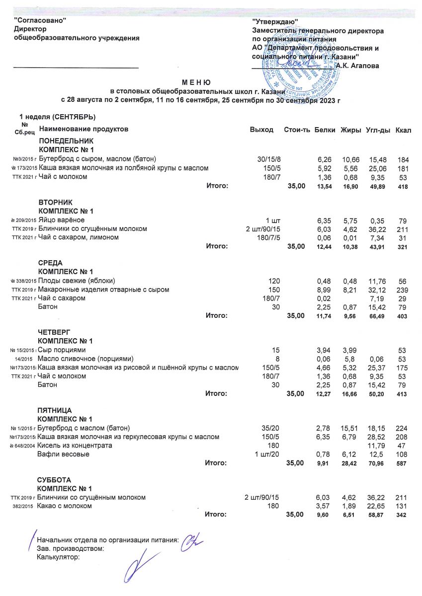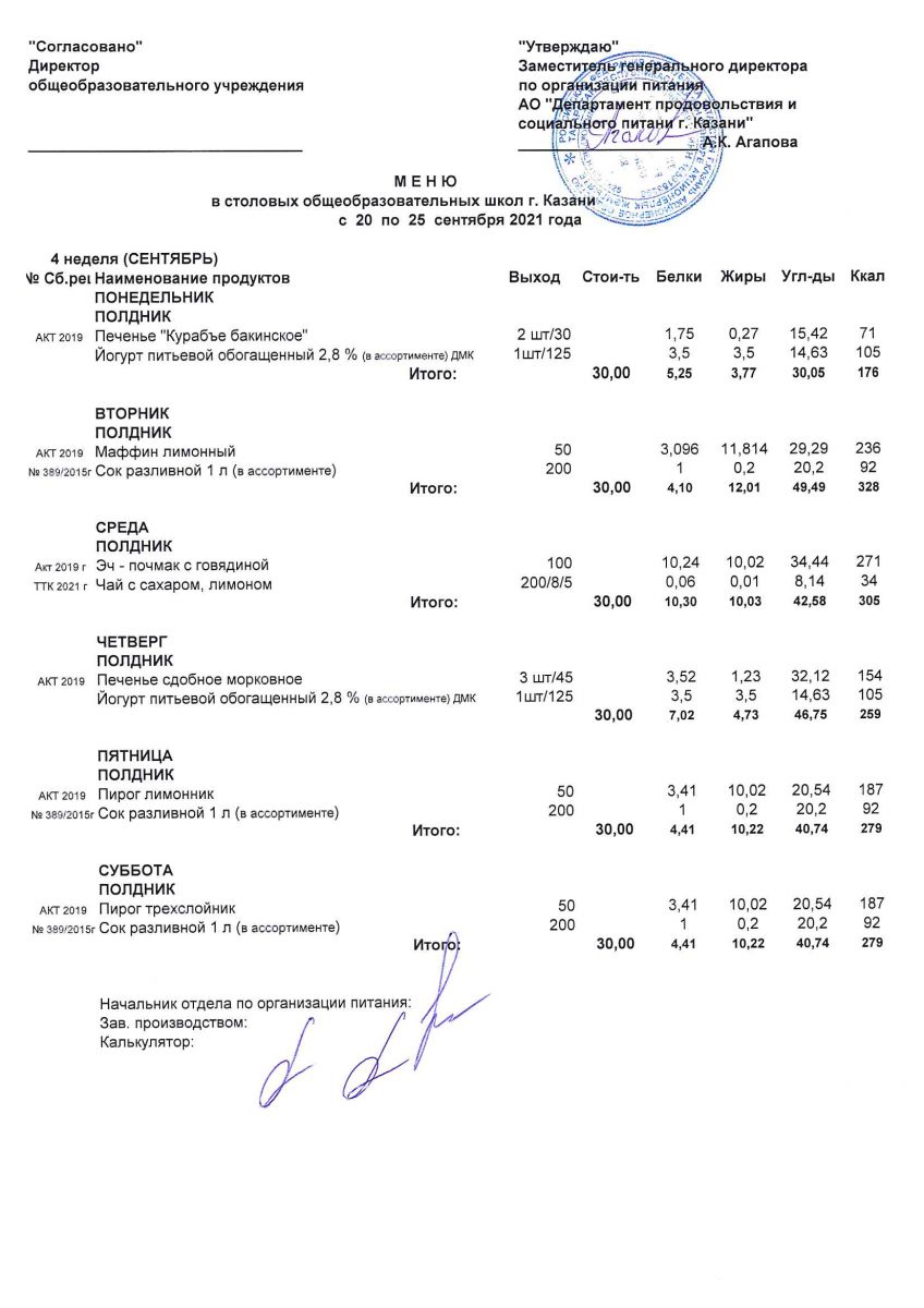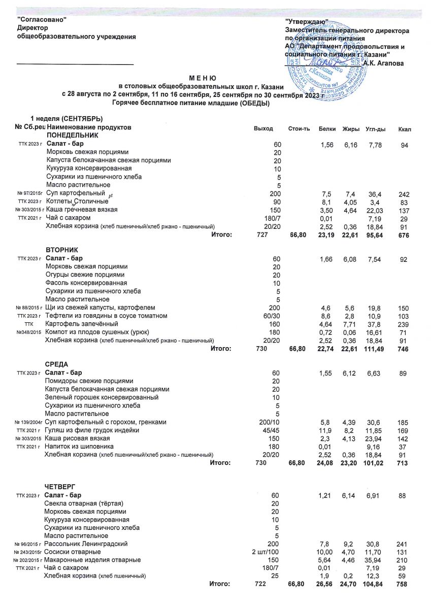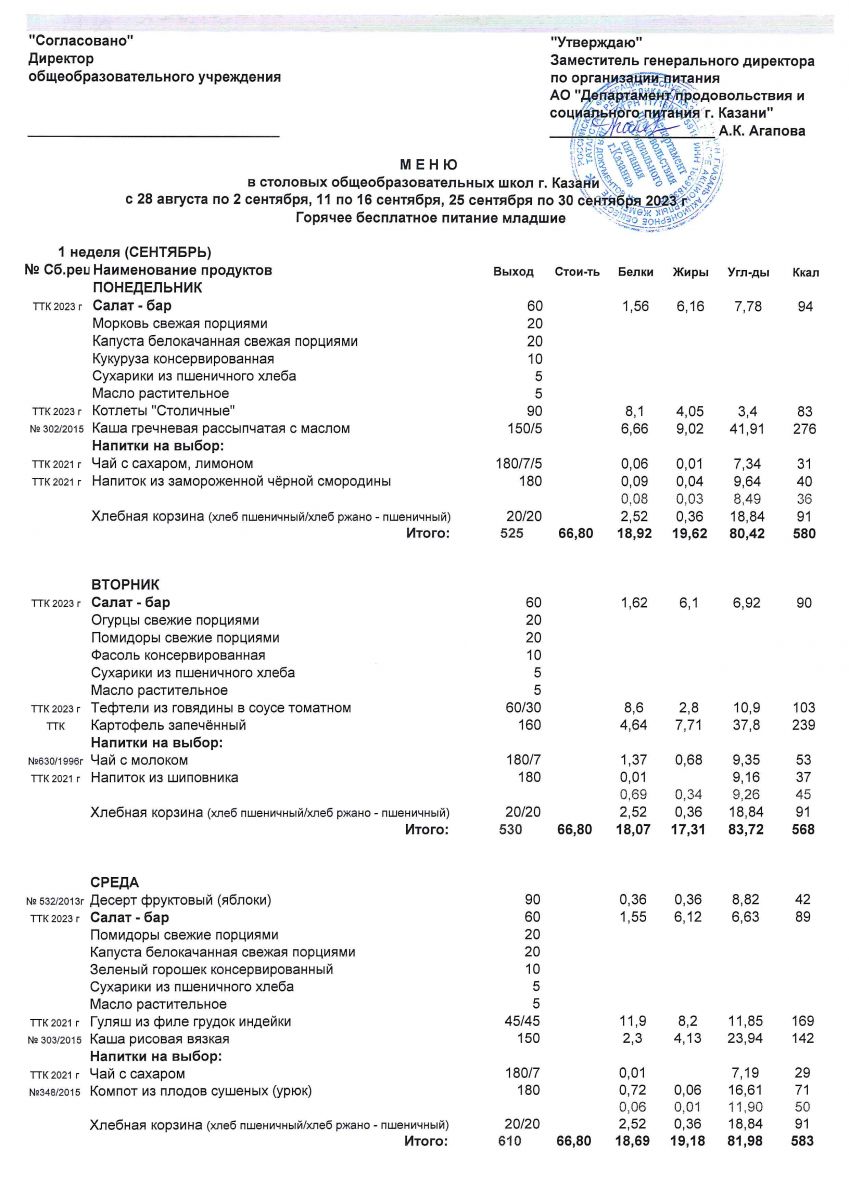 Меню с 1 сентябня по 2 сентября, с11-16 и 25 по 30 сентября