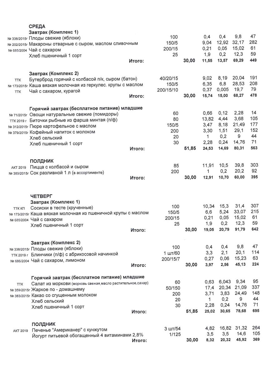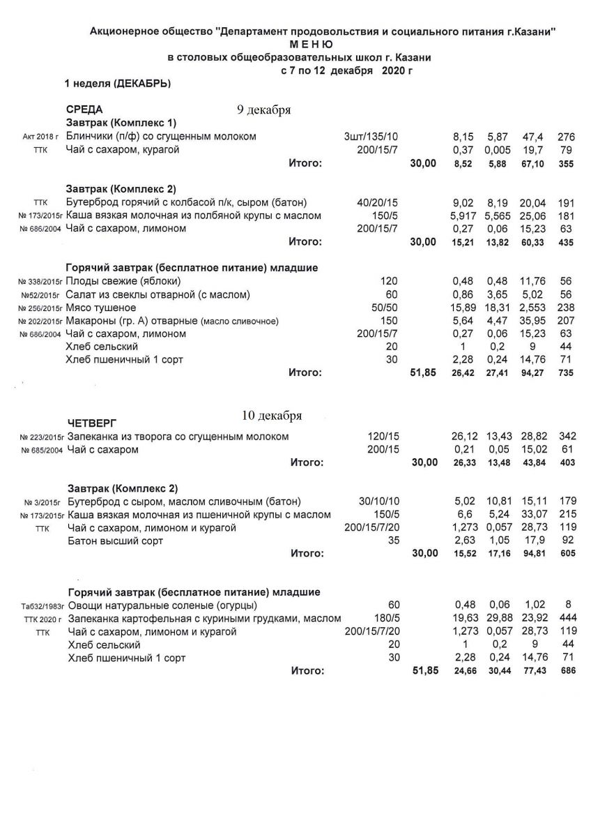Меню для учащихся начальной школы с 7 по 12 декабря 2020 года. Среда, четверг. Льготники