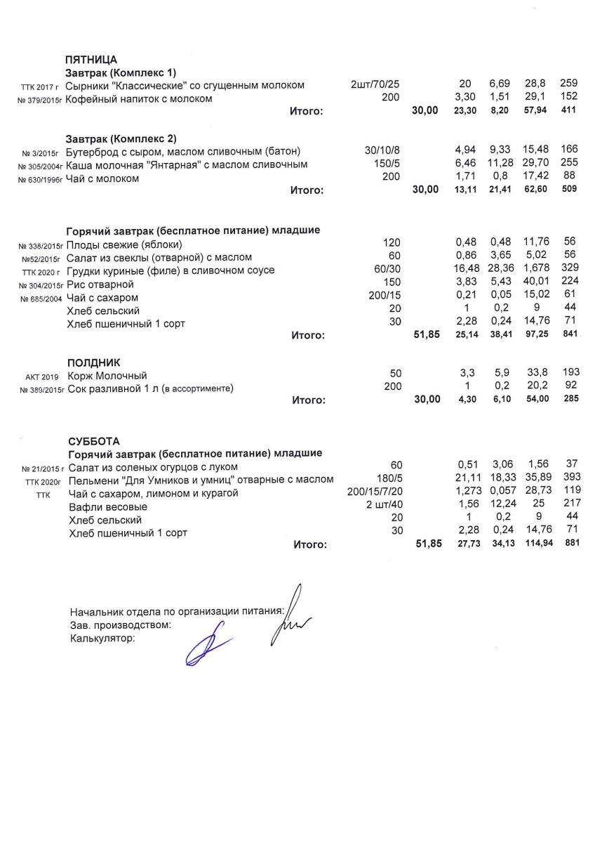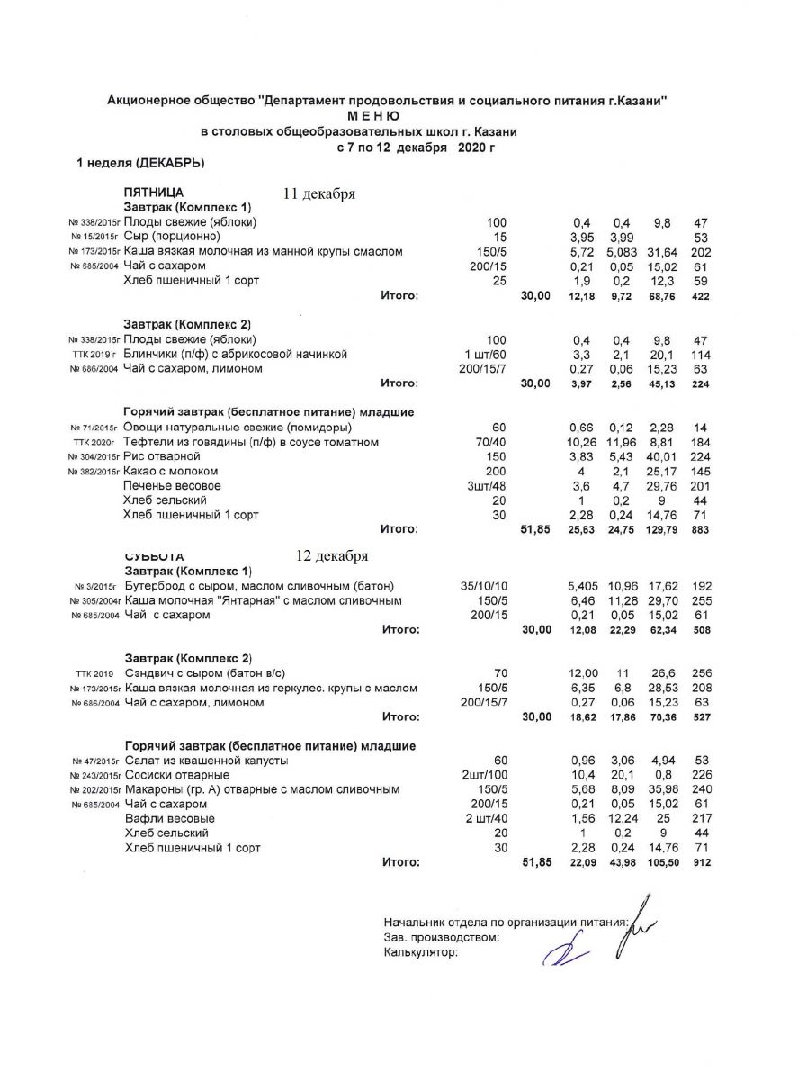 Меню для учащихся начальной школы с 7 по 12 декабря 2020 года. Пятница, суббота. Льготники