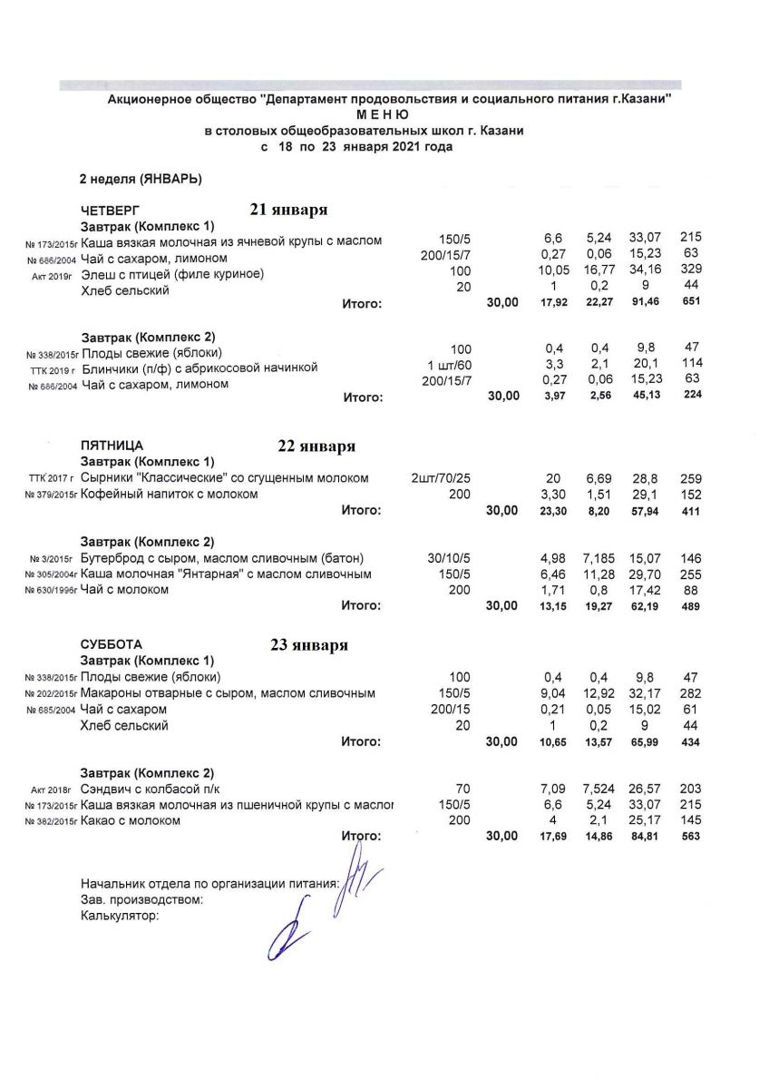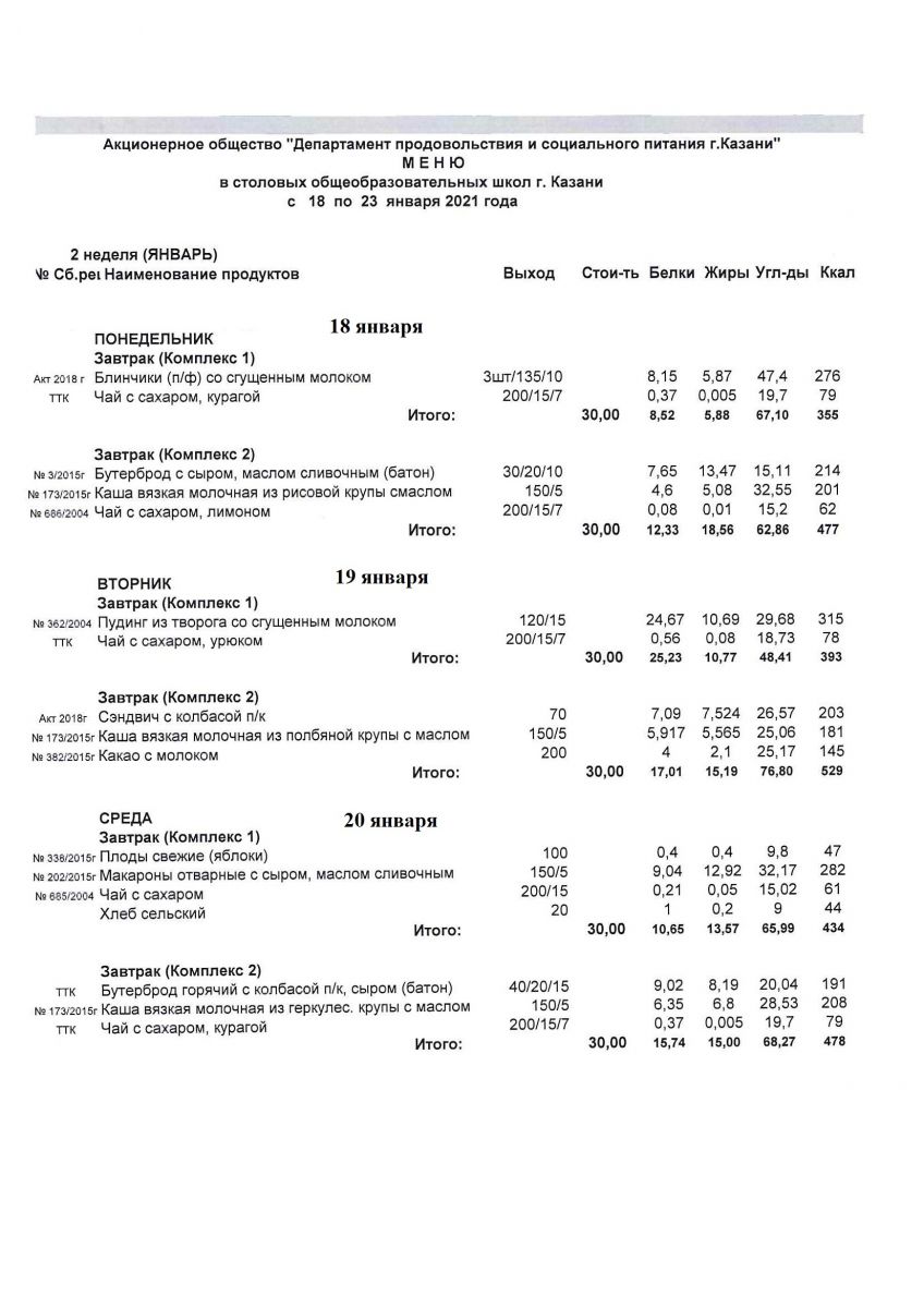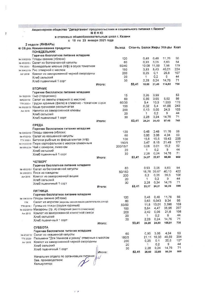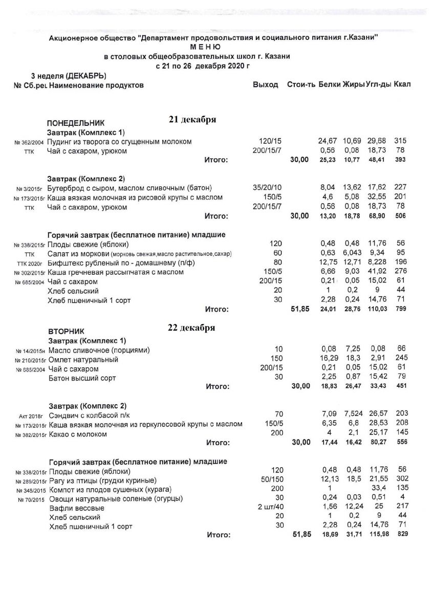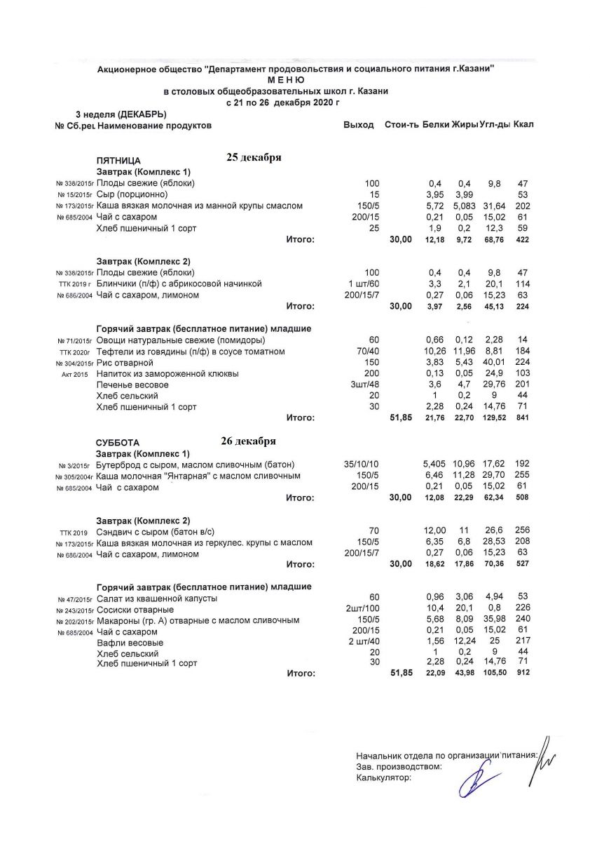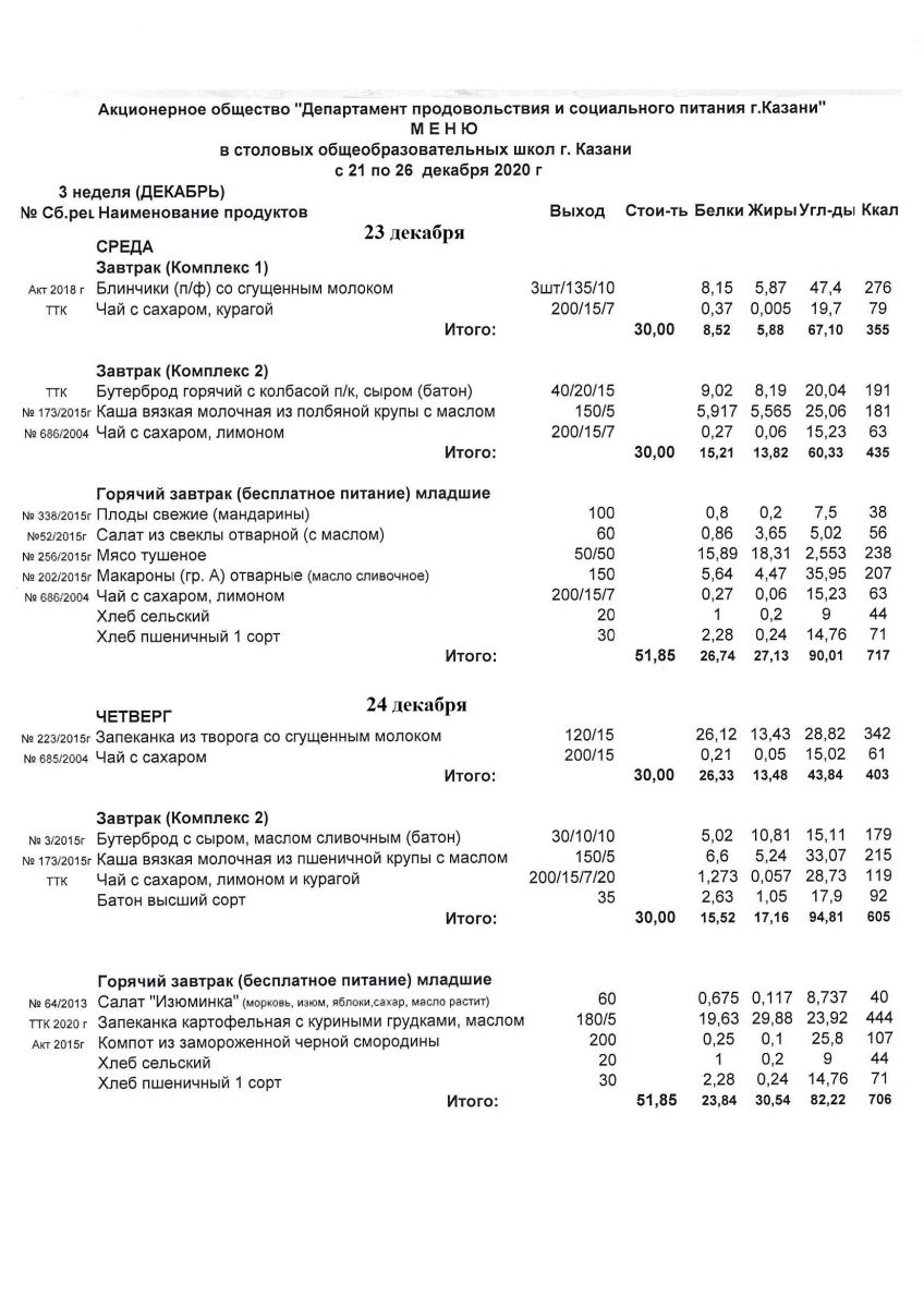 Меню для учащихся начальной школы 21 по 26 декабря 2020 года. Пятница, суббота. Льготники