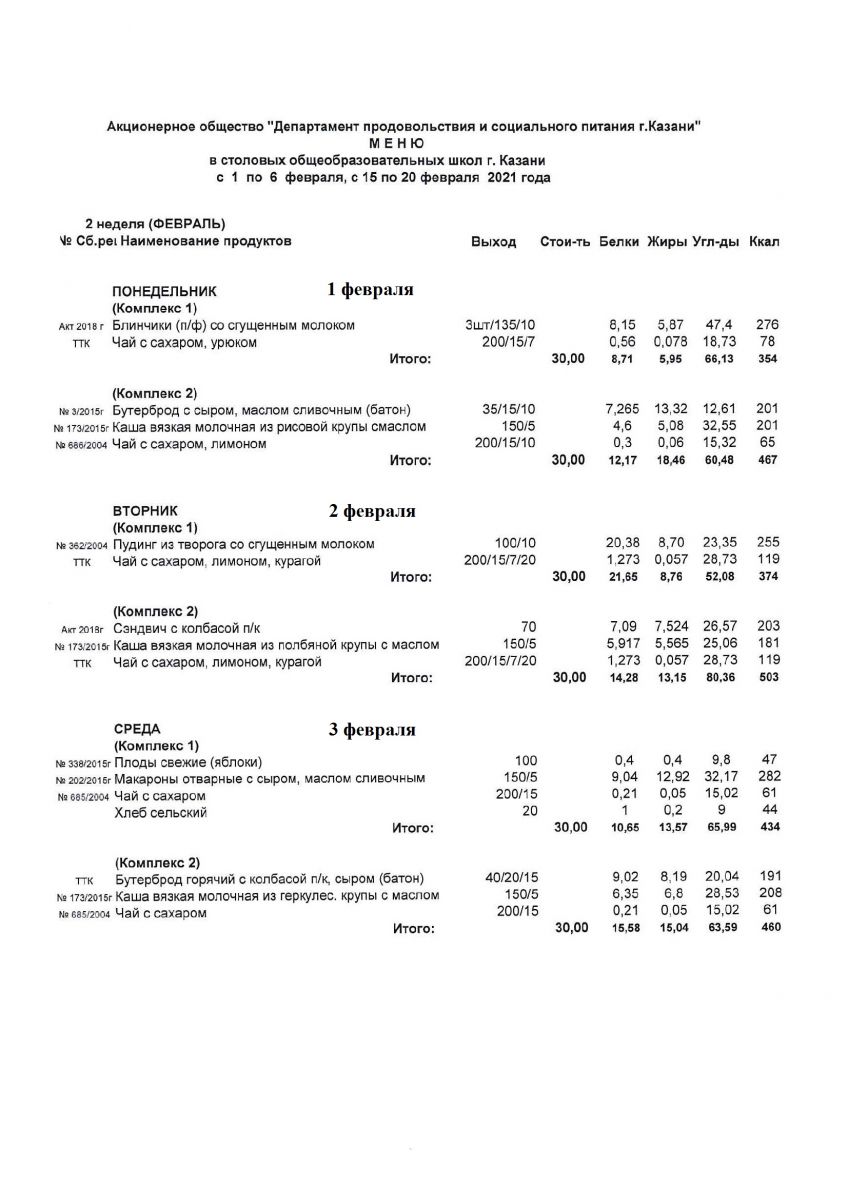 Меню горячего питания для детей, посещающих группу продленного дня с 1 по 6 февраля Пн,Вт,Ср