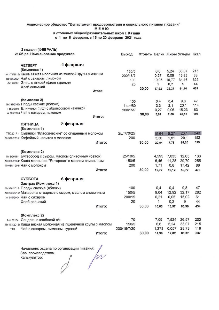 Меню горячего питания для детей, посещающих группу продленного дня с 1 по 6 февраля Чт,Пт,Сб