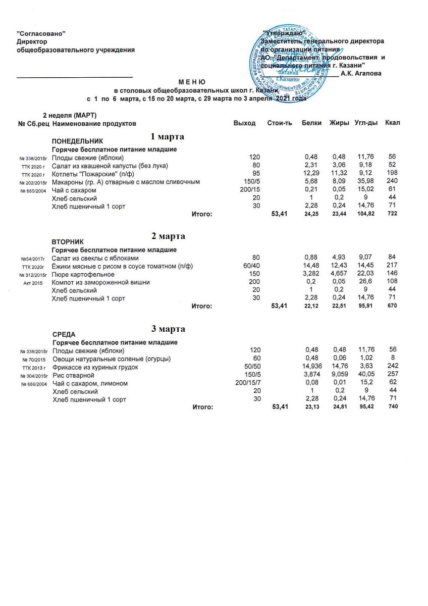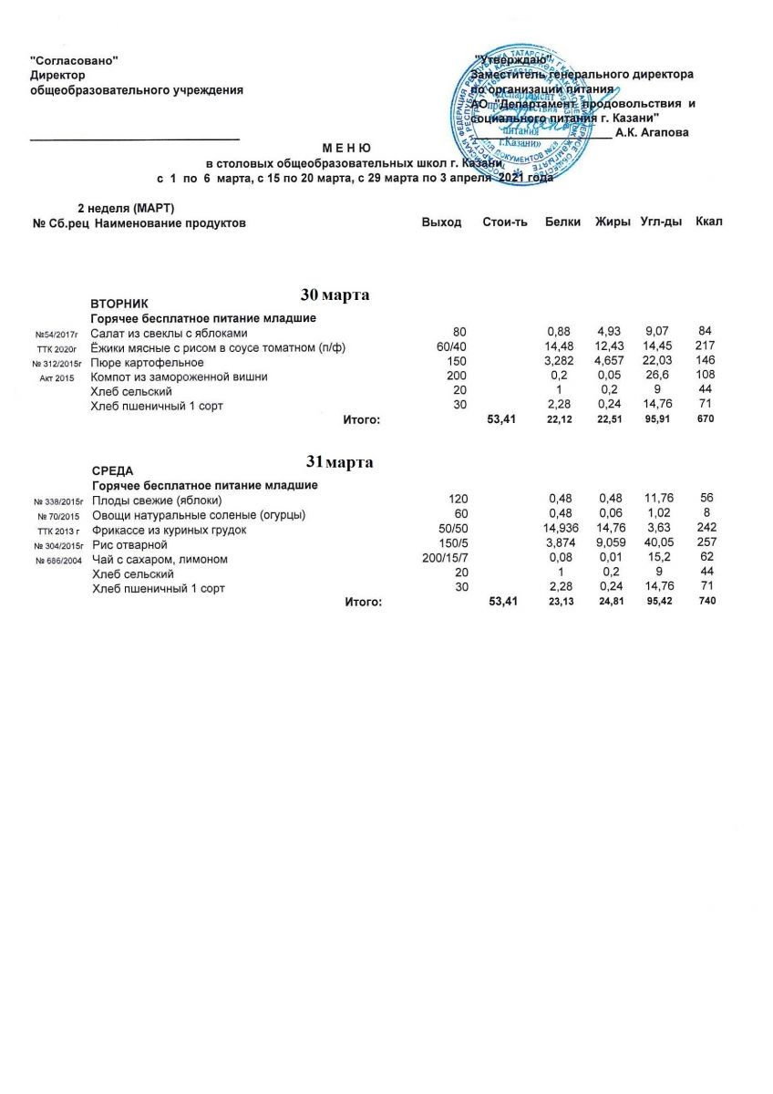 Меню для учащихся начальной школы с 30 марта по 3 апреля 2021 года. Льготники Пн, Вт, Ср