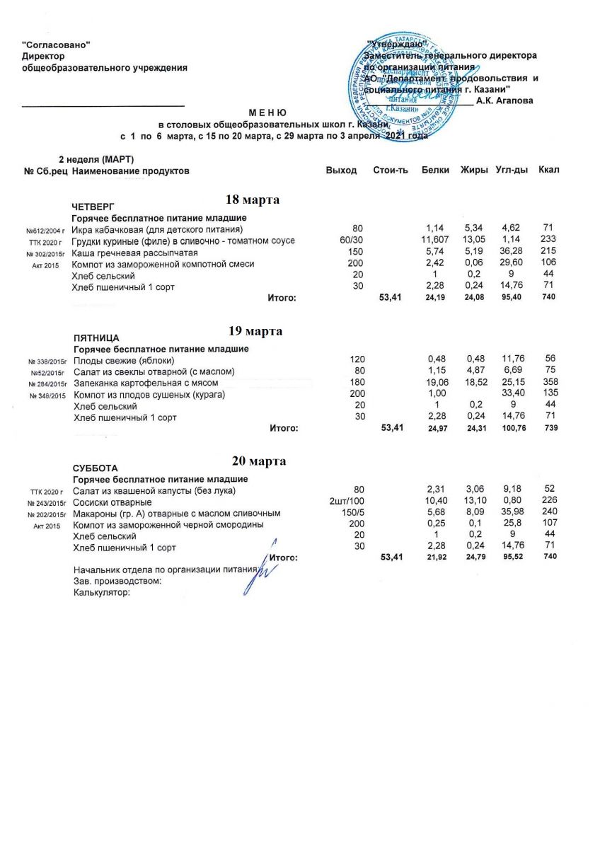 Меню для учащихся начальной школы с 15 по 20 марта 2021 года. Льготники Чт, Пт, Сб