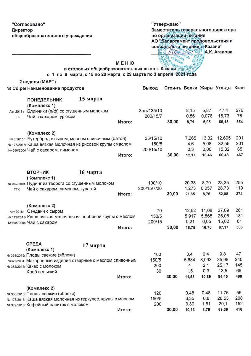 Меню для учащихся начальной школы с 15 по 20 марта 2021 года. Льготники Пн, Вт, Ср