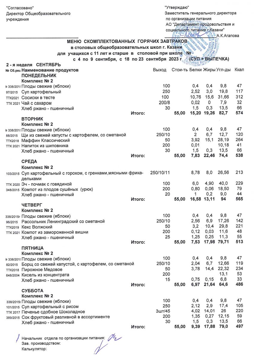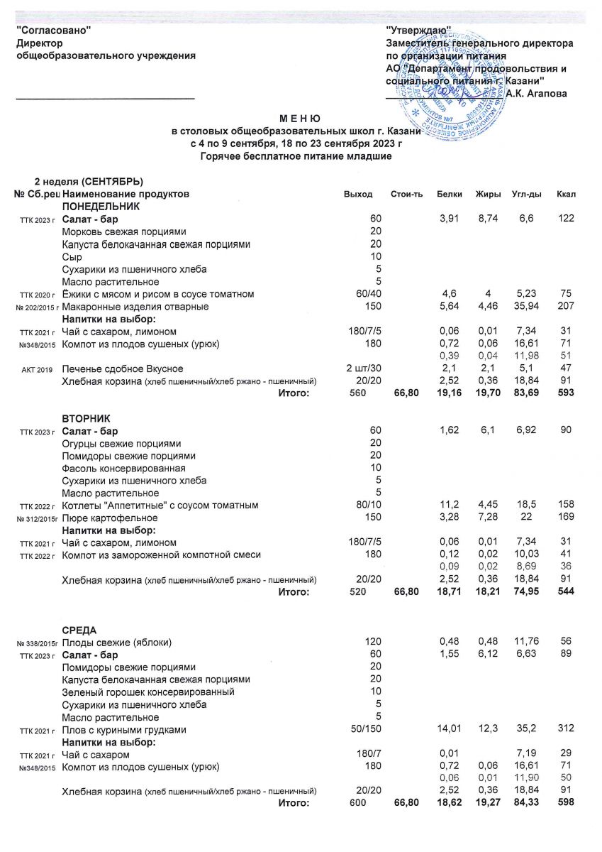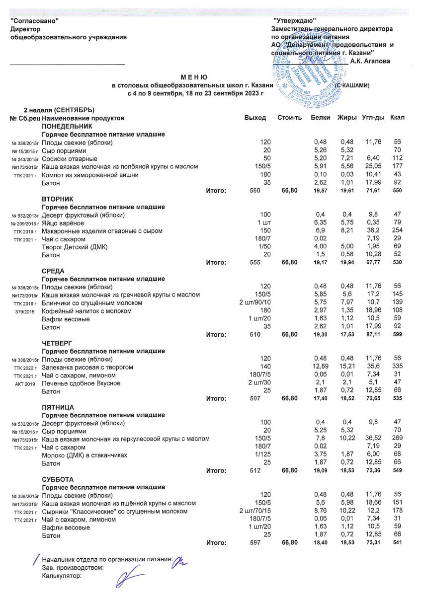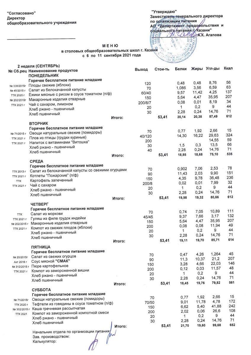 Меню для учащихся начальной школы с 6 по 11 сентября 2021 года. Льготники