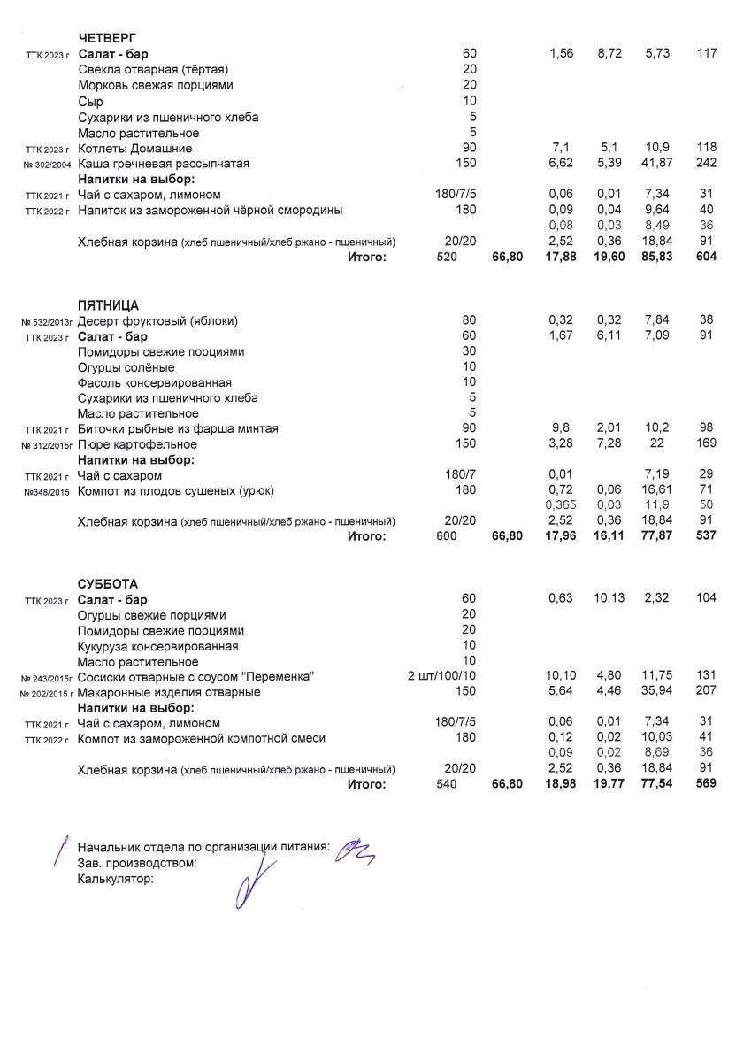 Меню горячего питания для детей, посещающих группу продленного дня Чт,Пт,Сб