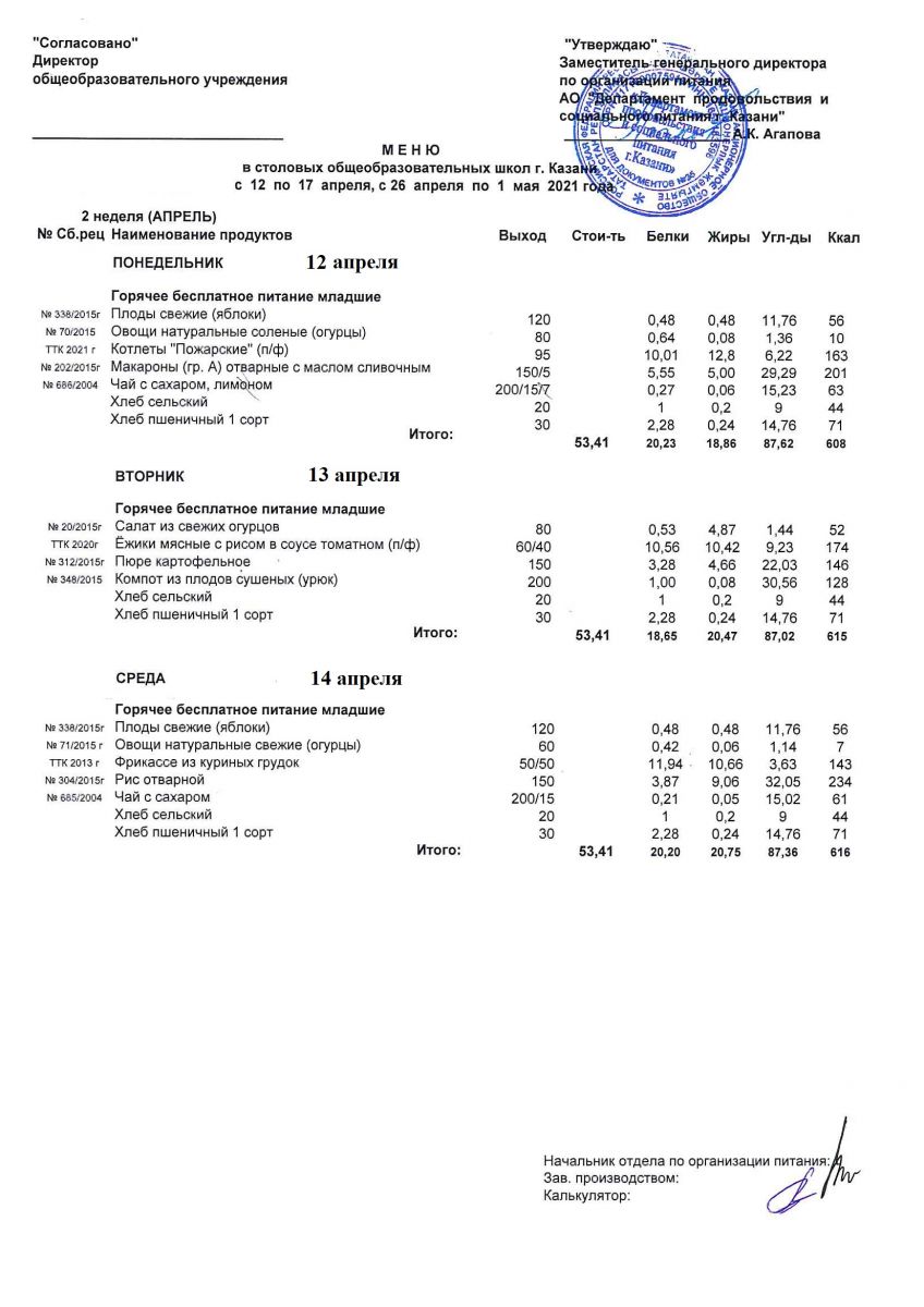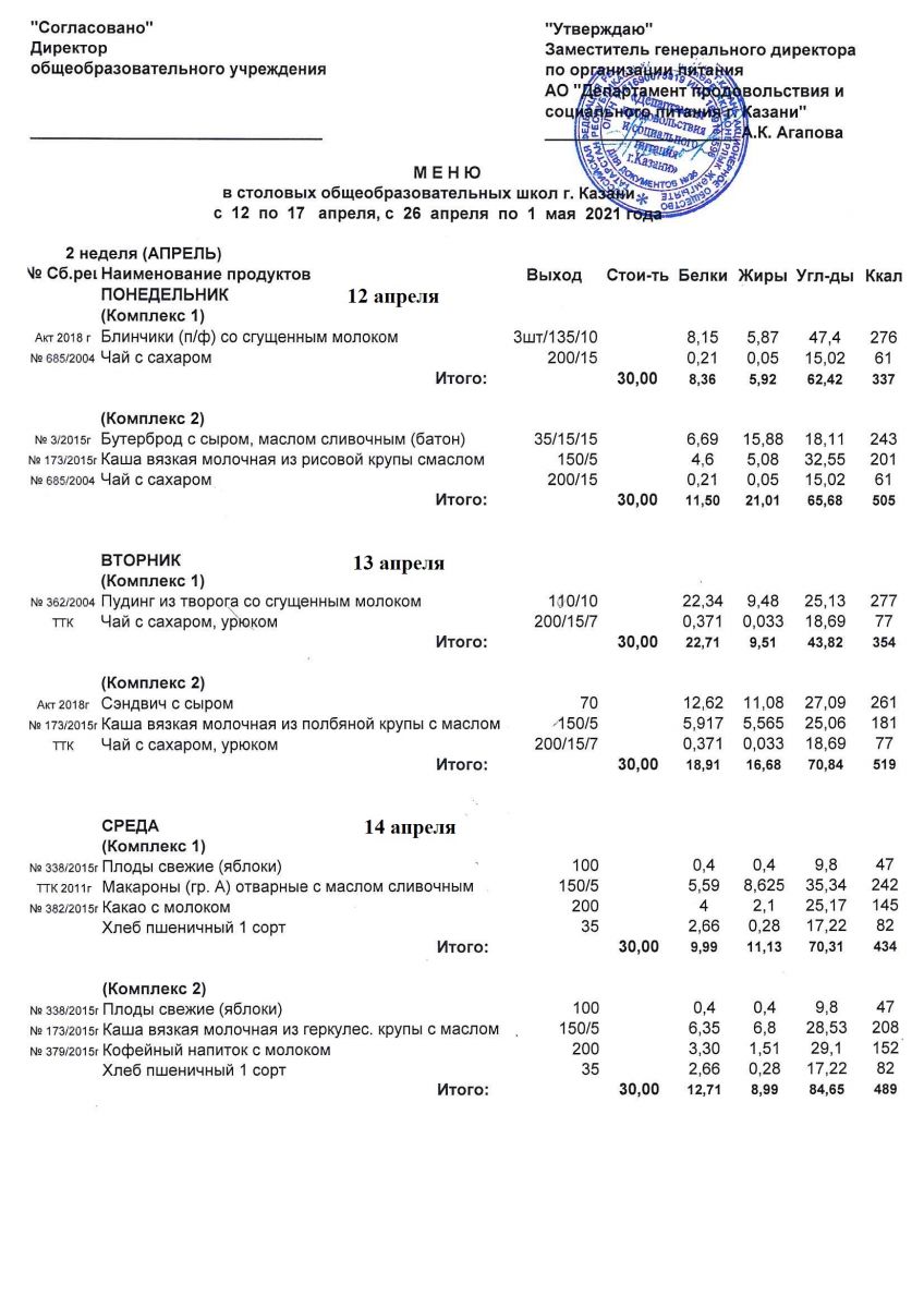 Меню для учащихся начальной школы с 12 по 17 апреля 2021 года. Льготники Пн, Вт, Ср