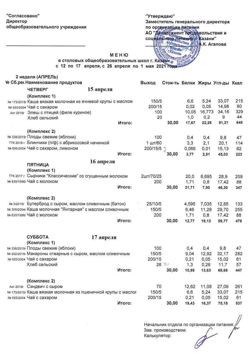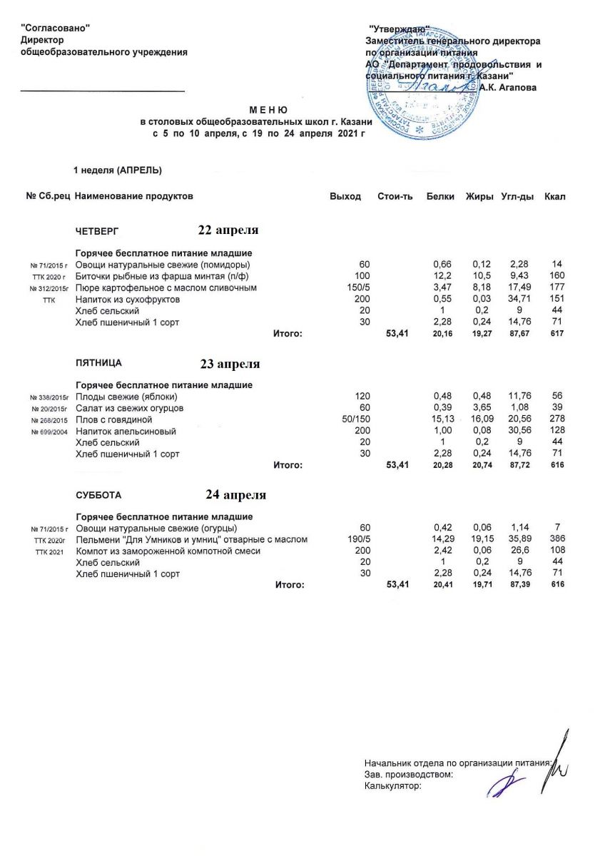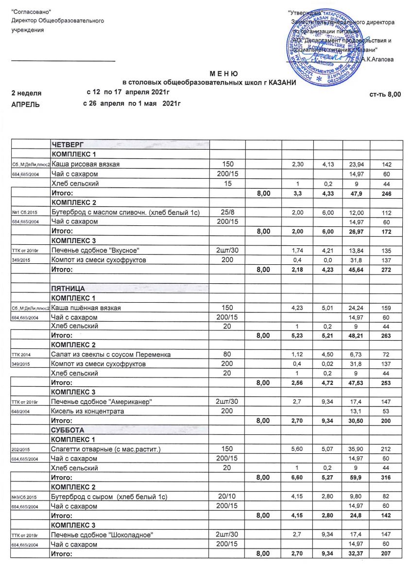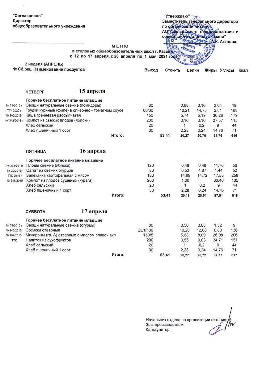 Меню для учащихся начальной школы с 12 по 17 апреля 2021 года. Льготники Чт, Пт, Сб