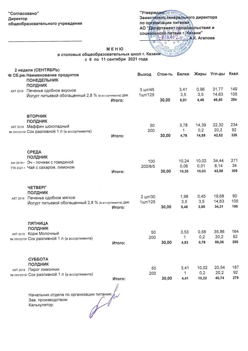 Меню полдников с 6 по 11 сентября 2021 года
