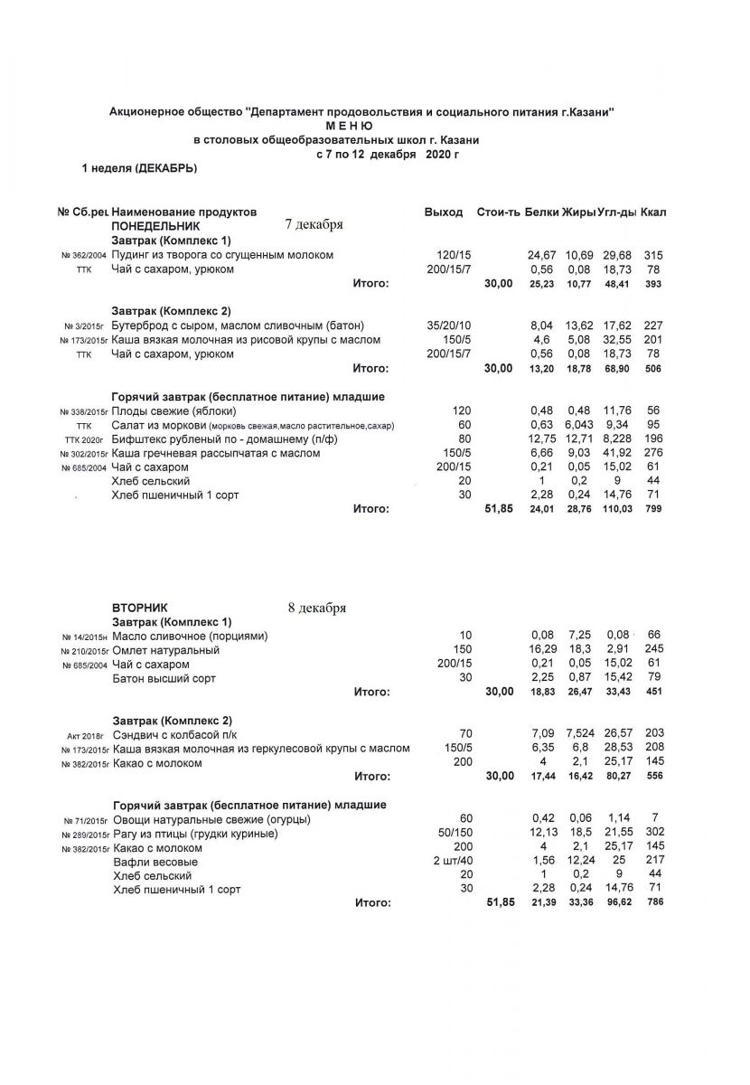 Меню для учащихся начальной школы с 7 по 12 декабря 2020 года. Понедельник, вторник. Льготники