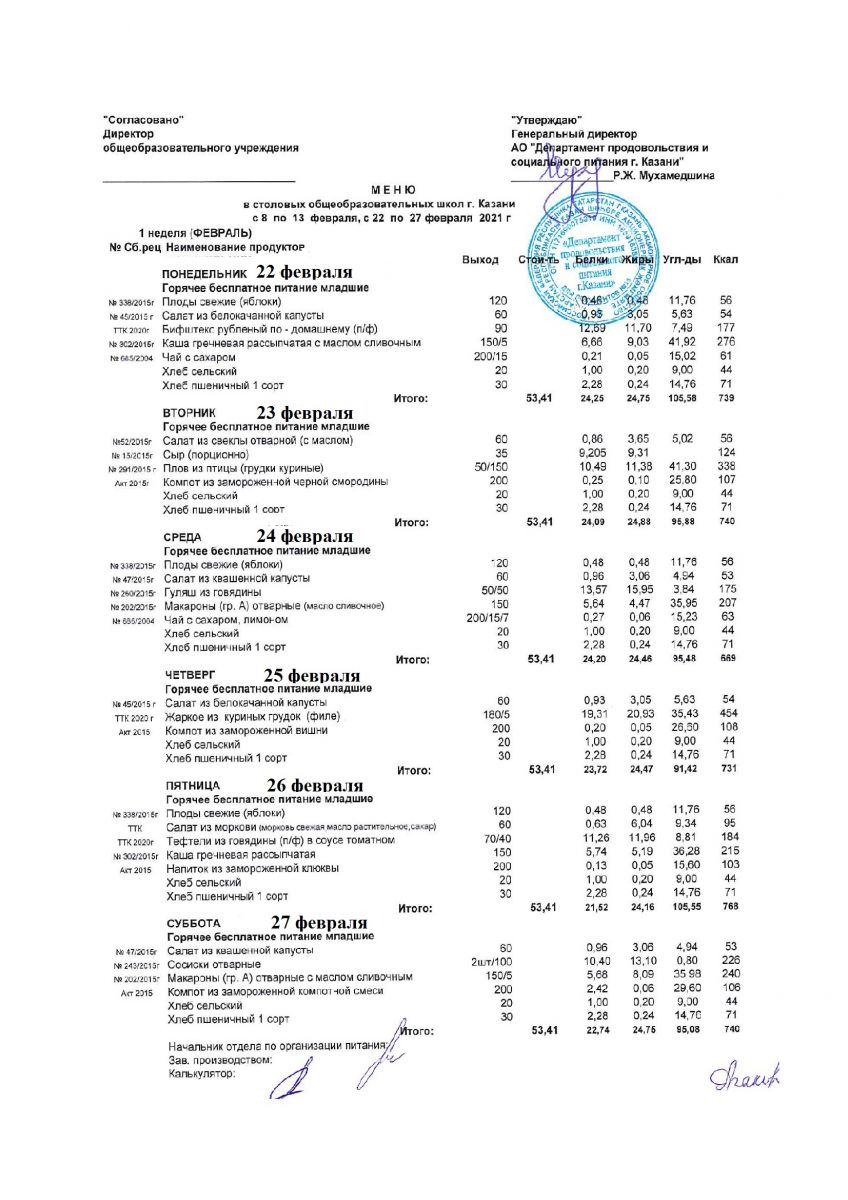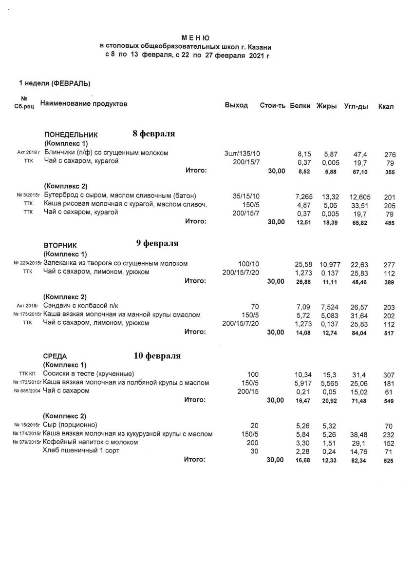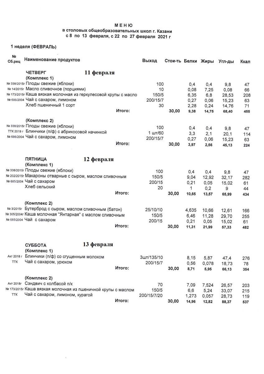 Меню для учащихся начальной школы с 8 по 13 февраля 2021 года. Льготники