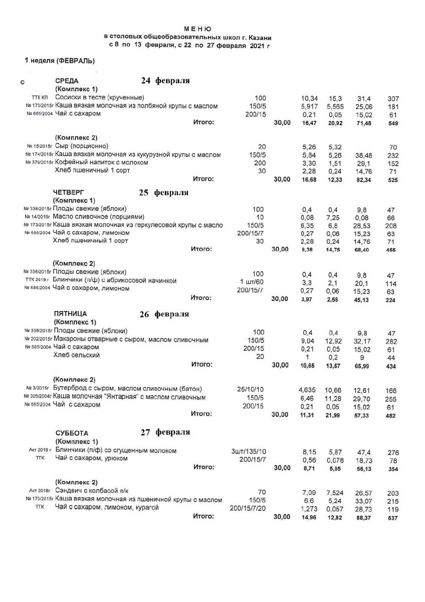Меню для учащихся начальной школы с 24 по 27 февраля 2021 года. Льготники