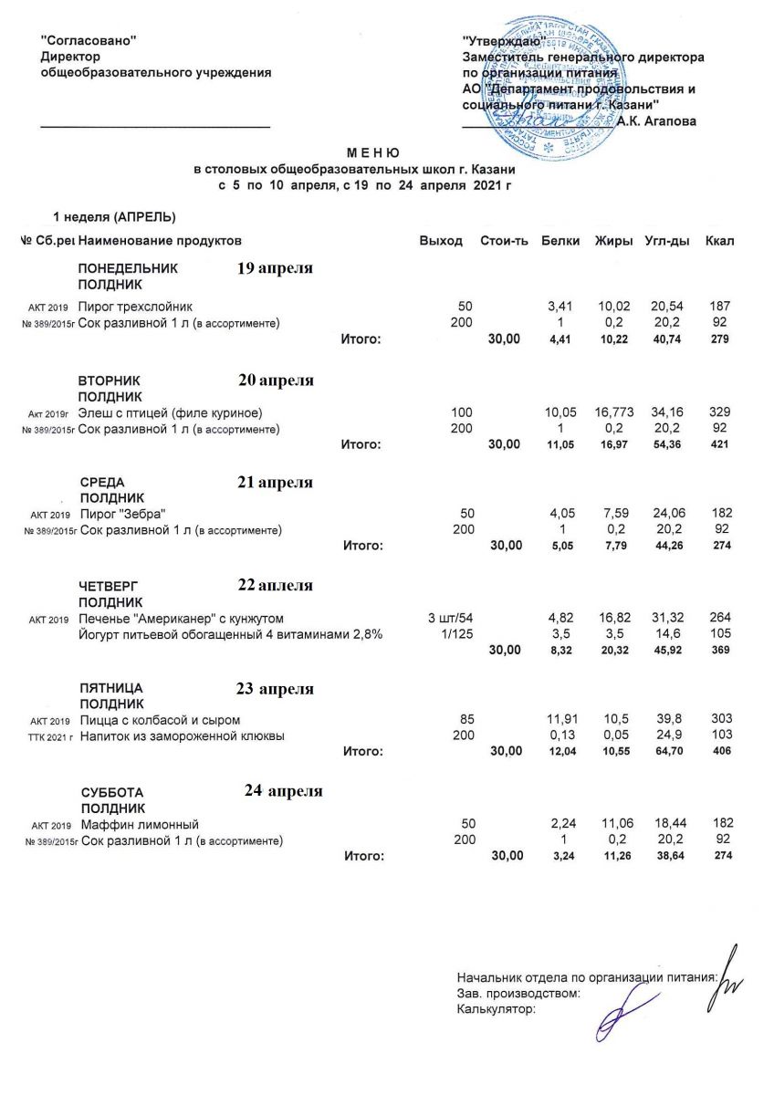 Меню полдников с 19 по 24 апреля 2021 года