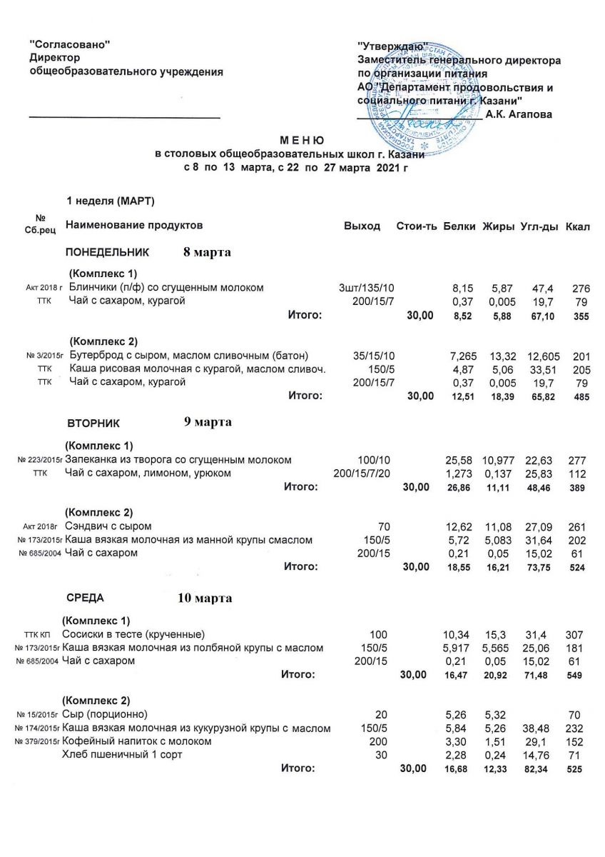 Меню для учащихся начальной школы с 8 по 13 марта 2021 года. Льготники Пн, Вт, Ср