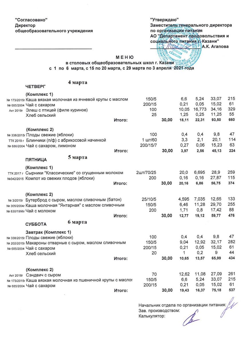 Меню для учащихся начальной школы с 30 марта по 3 апреля 2021 года. Льготники Чт, Пт, Сб