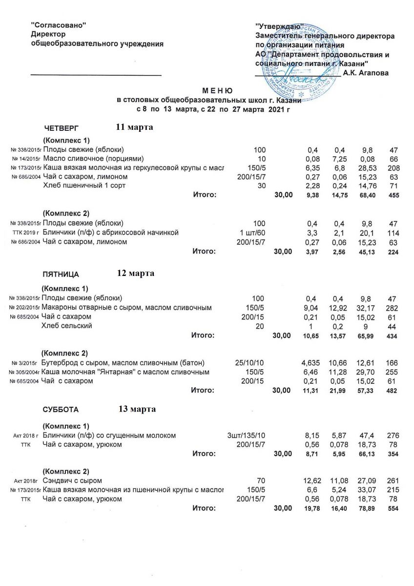 Меню для учащихся начальной школы с 8 по 13 марта 2021 года. Льготники Чт, Пт, Сб