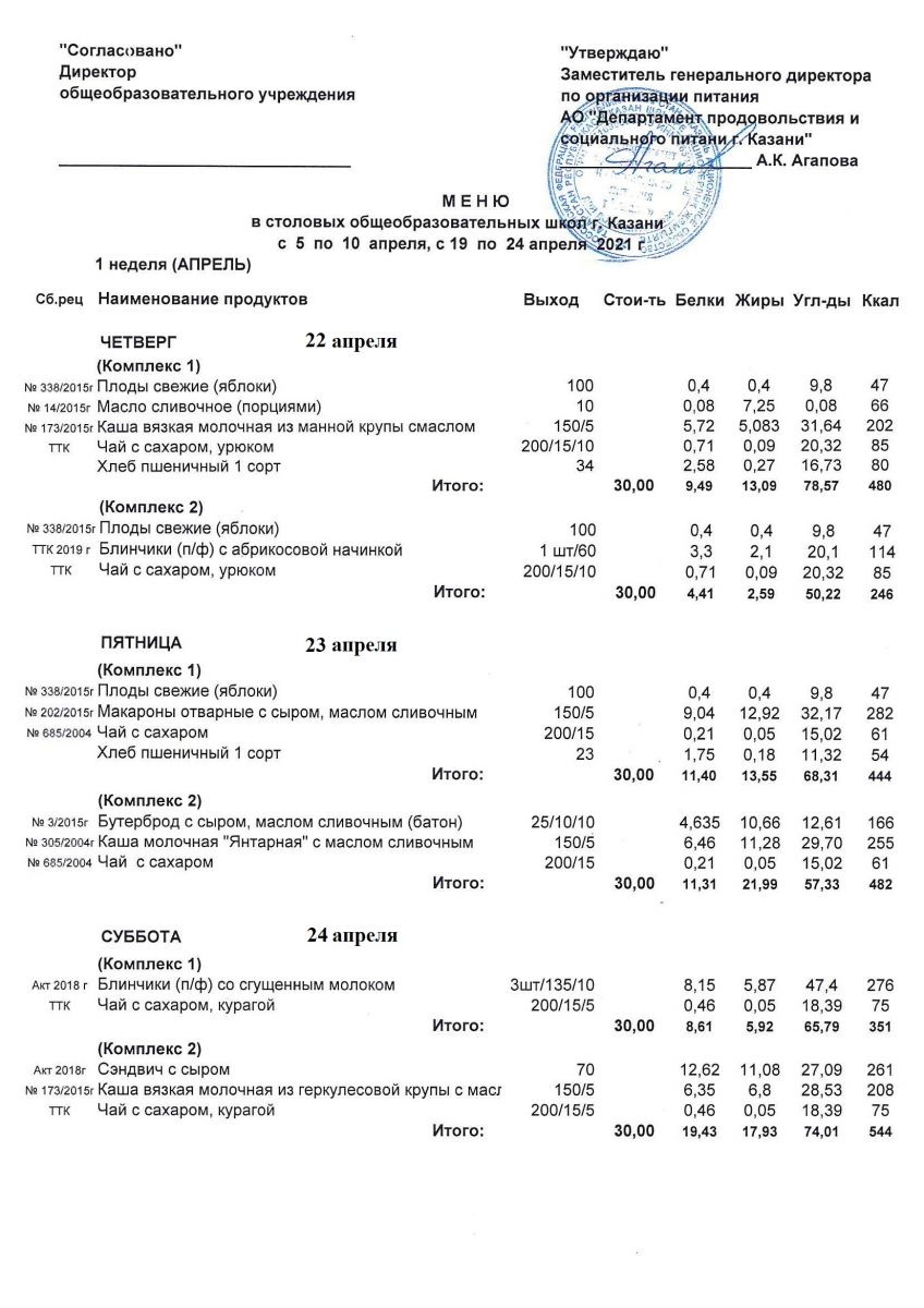Меню для учащихся начальной школы с 5 по 10 апреля 2021 года. Льготники Чт, Пт, Сб