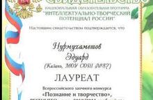 Поздравляем Нурмухаметова Эдуарда, ученика 9б класса,- активного участника заочного конкурса "Познание и творчество"