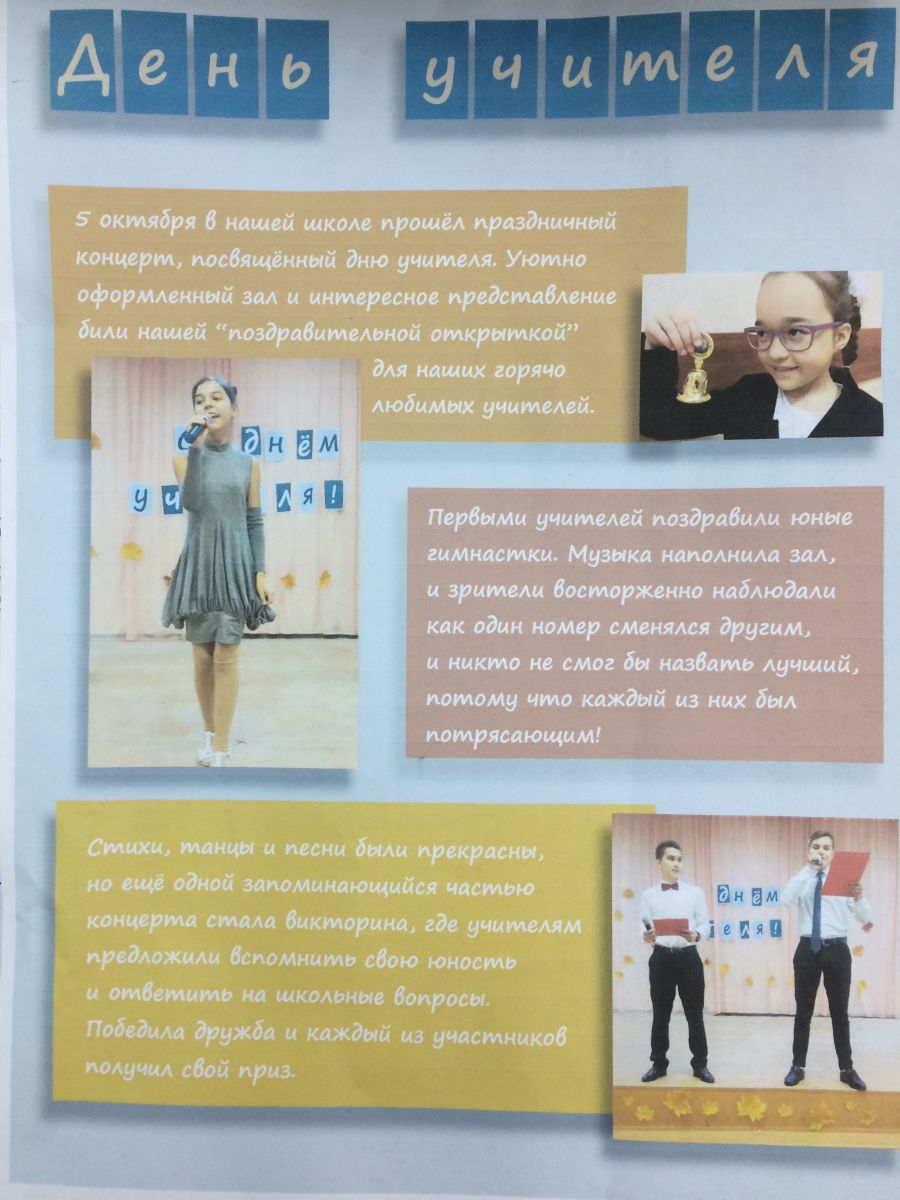 Опубликовано: 06.10.20185 октября в нашей школе прошел праздничный концерт, посвященный дню учителя. Уютно оформленный зал и интересное представление были нашей «праздничной открыткой» для наших горячо любимых учителей.