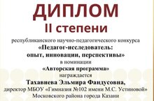 Авторская программа нашей гимназии стала призером республиканского научно-педагогического конкурса «Педагог-исследователь:опыт,инновации,перспективы» Поздравляем директора гимназии Эльмиру Фандусовну Тахавиеву и заместителя директора по учебной работе Тансылу Ильясовну Мирсияпову!