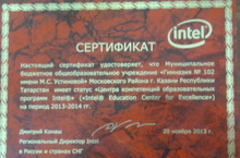 20 ноября 2013г. гимназии №102 был присвоен статус "Центра компетенций образовательных программ Intel" на период 2013-2014гг.