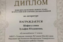 Шафигуллина Зөлфия рус әдәбиятыннан регион этабында 3 нче ел рәттән җиңү яулады. Котлыйбыз сине, Зөлфия! Россия этабында да зур уңышларга ирешүеңне теләп калабыз!