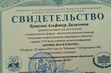 Педагог дополнительного образования Бушуева Альфанур Далиловна приняла участие во Всероссийском педагогическом форуме "Актуальные вопросы развития образования и общества" и выступила с докладом "Приоритетные направления развития образования в условиях ФГОС". Форум прошел 22 апреля в Москве в рамках Всероссийской детской конференции "Первые шаги в науке".