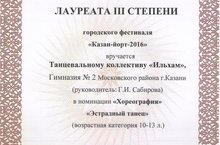 Шәһәр күләмендә уздырылган "Казан-йорт 2016" фестиваль-конкурсында гимназиябезнең "Илһам" бию ансамбле (җитәкчесе - Г.И.Сабирова) 3 нче дәрәҗә лауреат исеменә лаек булды. Җиңүче укучыларыбызны котлыйбыз, алга таба да иҗади уңышлар телибез.