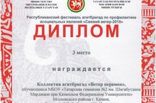 Коллектив агитбригады гимназии "Ветер перемен" занял 3 место в Республиканском фестивале агитбригад по профилактике асоциальных явлений "Свежий ветер" (руководители: Г.И.Сабирова, Г.Р.Настявина). Поздравляем! Желаем творческих успехов!