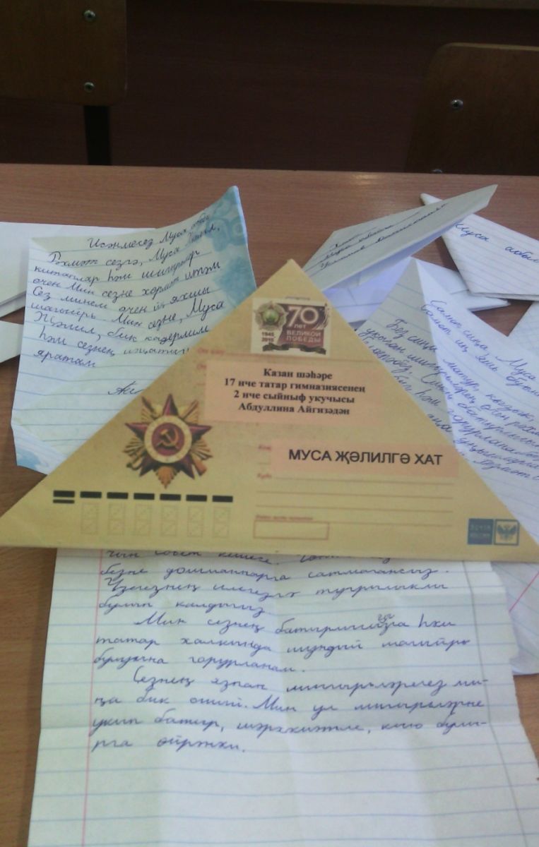 2 А сыйныф укучылары бөек шагыйрь - патриот Муса Җәлилгә хатлар язды. Алар рәхмәт сүзе, соклану , горурлык хисләре белән сугарылган. Фото.