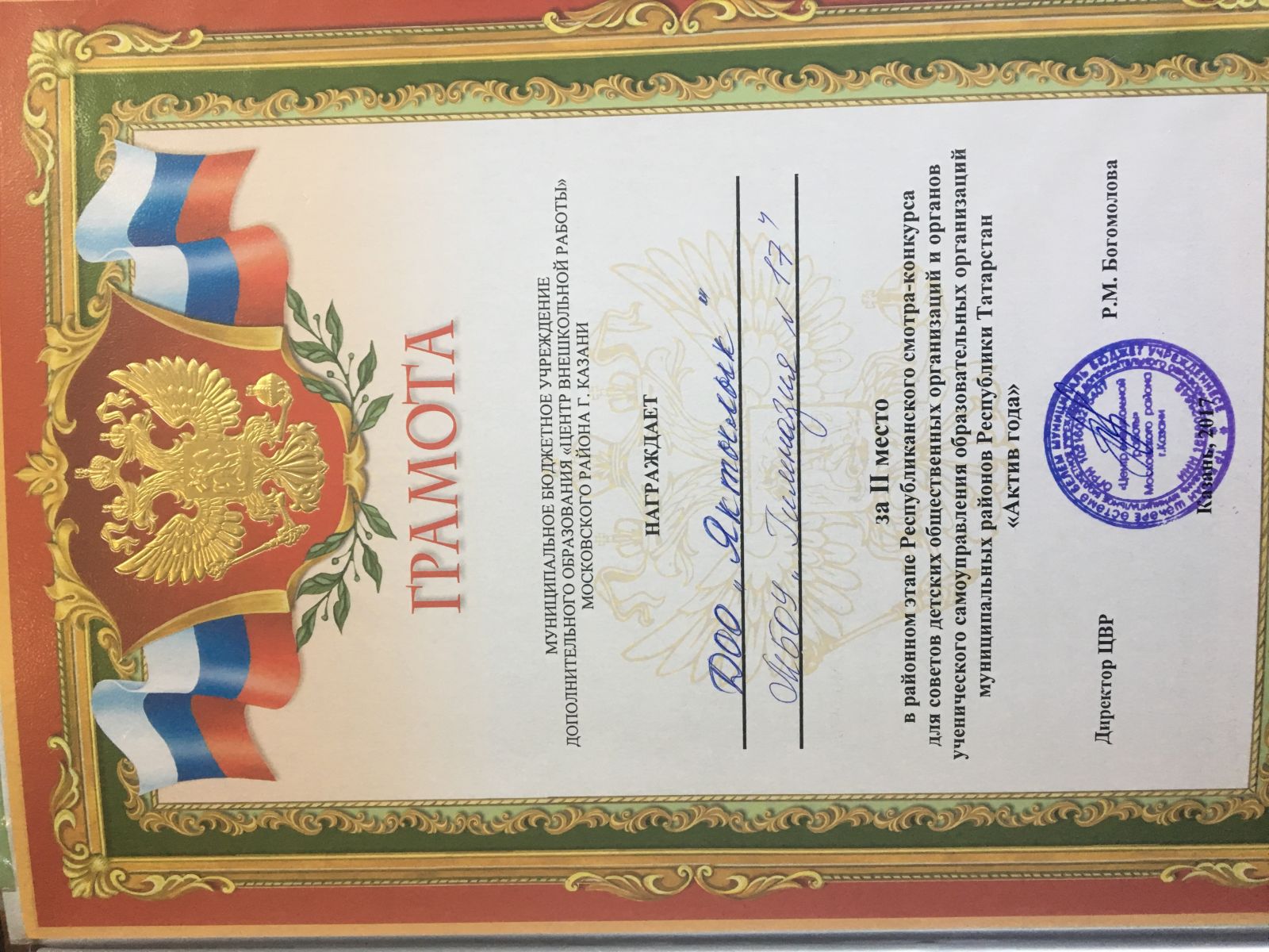 Районный этап Республиканского смотра- конкурса для советов ДОО и органов ученического самоуправления ОО МР РТ "Актив года" - 2 место