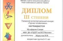 Поздравляем Музафарову Самиру, учащуюся объединения Web-дизайн (педагог Меркутова Ирина Ивановна) с 3 местом в городском Турнире головоломок, который прошел 18 февраля на базе МБУ ДО «ЦВР» Ново-Савиновского района!