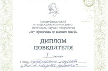 Учащиеся объединения "Азбука музееведения" (педагог Ногманова А.И.) Шакурова Камиля и Сыченкова Агата приняли участие в I республиканском (с всероссийским участием) фестивале науки и творчества "От Пушкина до наших дней" и стали победителями. Поздравляем! Желаем продолжать в том же духе!