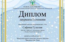 Поздравляем Сафину Гузелию победителя Международного конкурса изобразительного искусства, декоративно-прикладного творчества и фотографии "Фантизии морозной зимы"