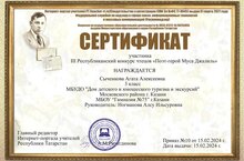 Поздравляем Сыченкову Агату, которая приняла активное участие в III Республиканском конкурсе чтецов "Поэт- герой Муса Джалиль". Руководитель - педагог дополнительного образования А.И. Ногманова.