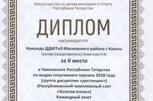 7 ноября 2018 года в Выставочном центре «Казанская ярмарка» состоялась торжественная церемония награждения победителей и призеров II Туриады (Спартакиады) среди обучающихся Республики Татарстан 2017-2018 учебного года (далее - Туриада). В торжественной церемонии награждения приняло участие более 200 человек. Команда МБУДО "ДДЮТиЭ" Московского района г.Казани награждена дипломом лауреата II Туриады (Спартакиады) среди обучающихся РТ 2017-2018 учебного года.