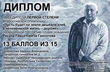 Поздравляем Юсупову Камилю, Шарипову Зарину - победительниц Всероссийского олимпиады "Пусть будет на земле дешевле хлеб, а человеческая жизнь - дороже", посвященной 100-летию со дня рождения Расула Гамзатовича Гамзатова.