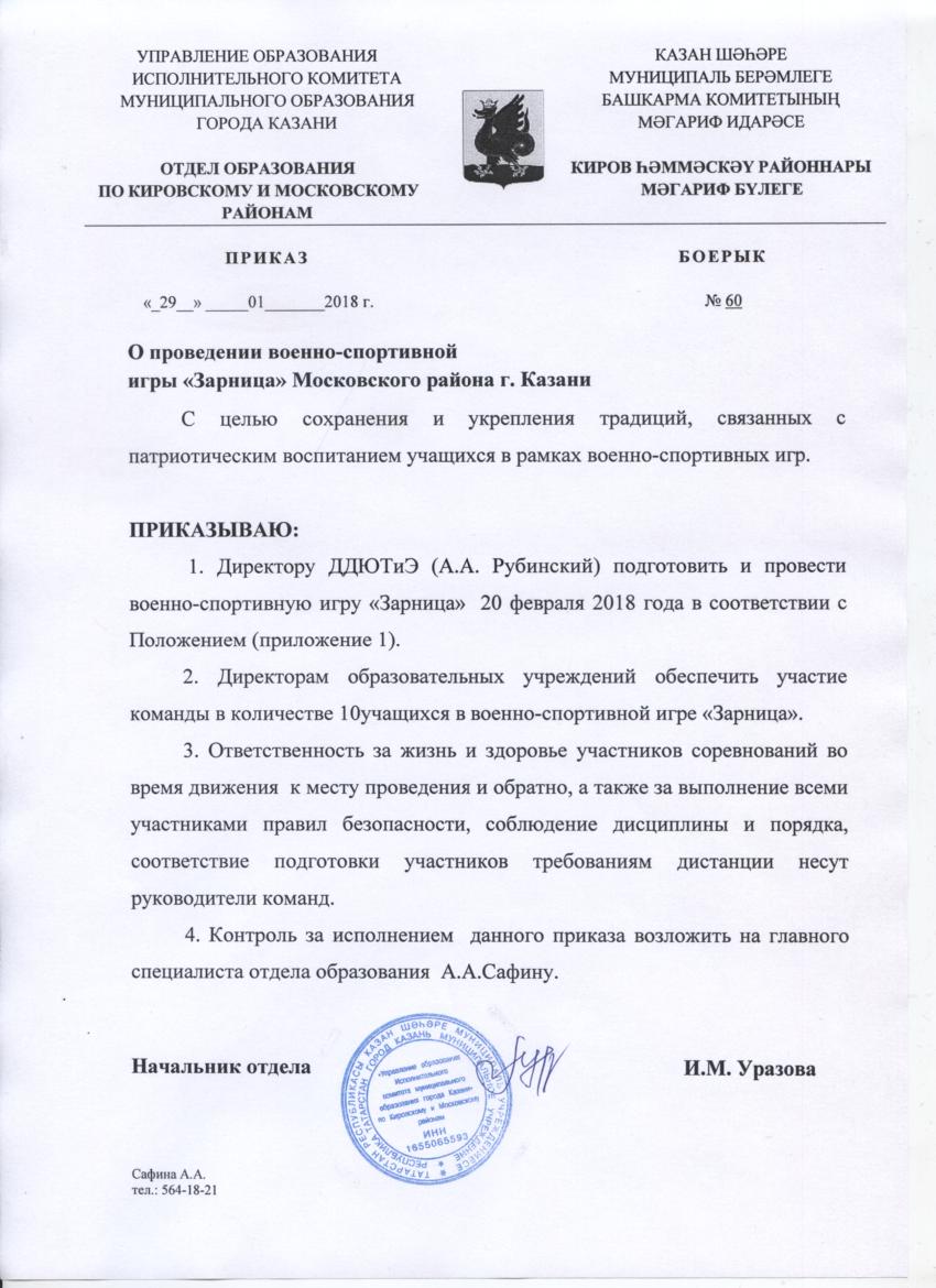Приказ о проведении военно-спортивной игры "Зарница" Московского района г.Казани