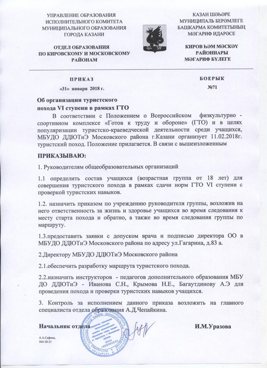 Приказ об организации туристского похода VI ступени в рамках ГТО