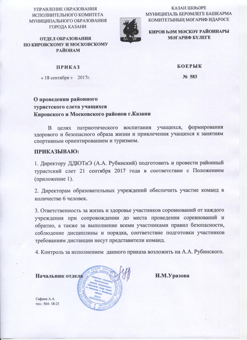 Приказ о проведении районного туристского слета учащихся Кировского и Московского районов г.Казани