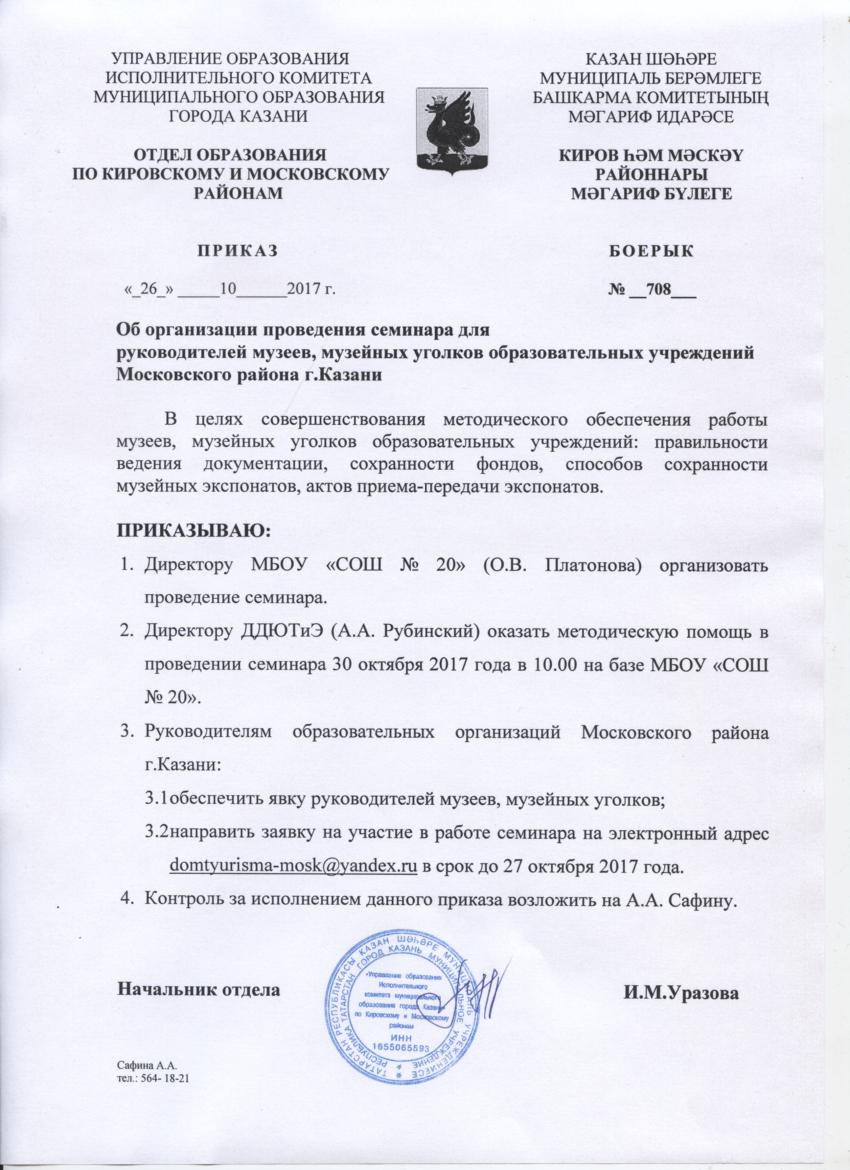 Приказ о б организации проведения семинара для руководителей музеев, музейных уголков образовательных учреждений Московского района г.Казани
