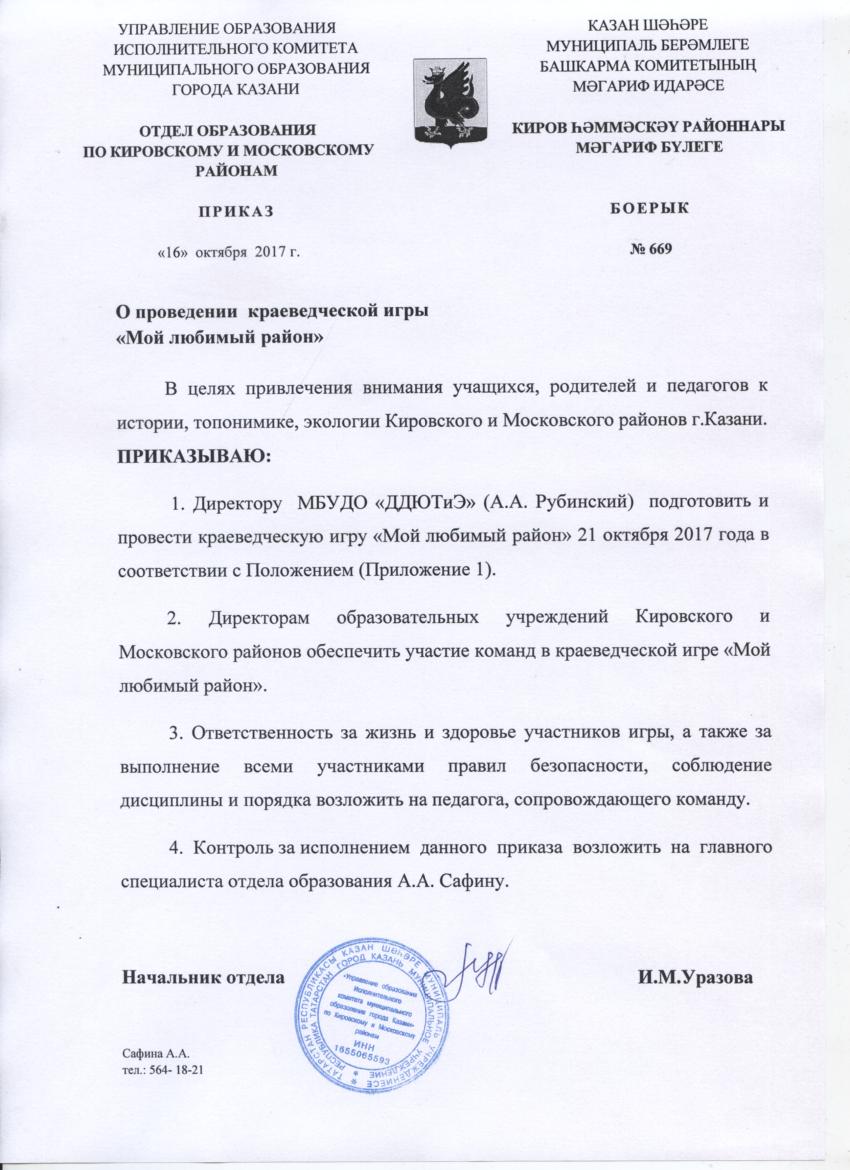 Приказ о проведении краеведческой игры "Мой любимый район"